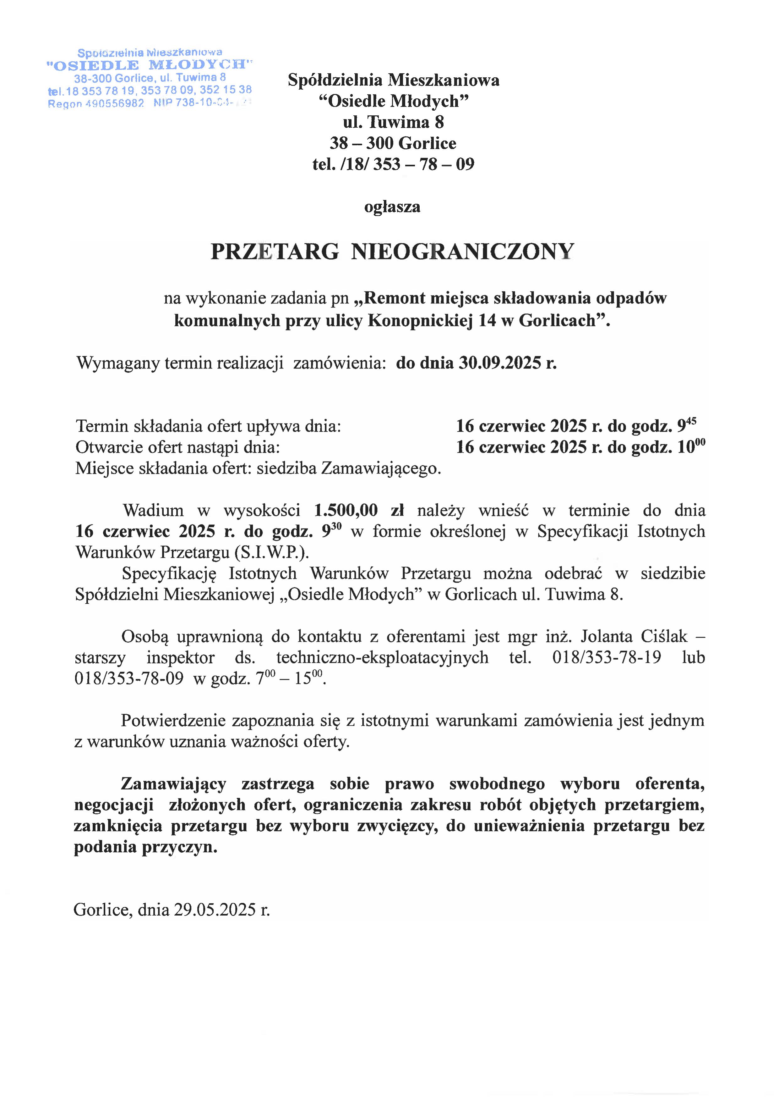Przetarg nieograniczony na wykonanie zadania pn "Remont miejsca składowania odpadów komunalnych przy ulicy Konopnickiej 14 w Gorlicach"